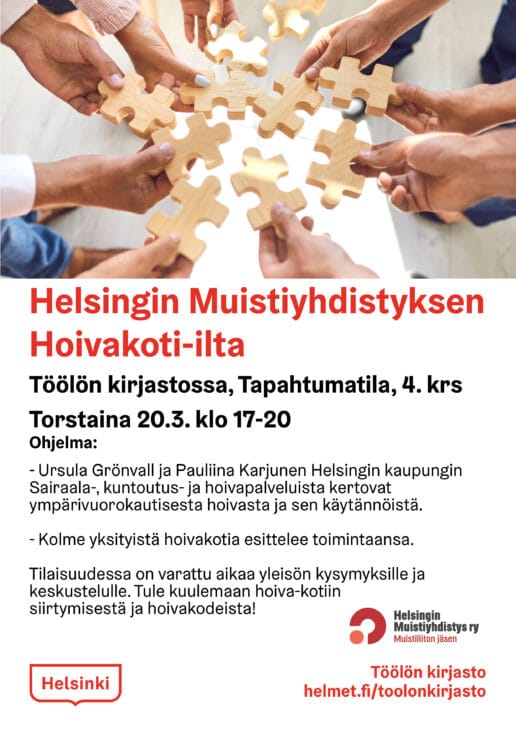 Helsingin Muistiyhdistys järjestää Hoivakoti-illan Töölön kirjastolla 20.3. klo 17-20.