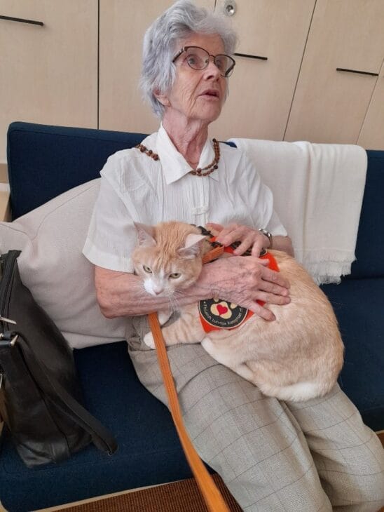 Suomen Karva-Kavereiden suloinen Dino kissa asiakkaan sylissä.