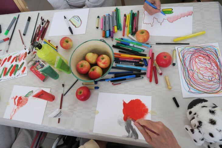 Kyniä ja papereita levittäessäni kuulen välillä pöydän ääreen ohjatuilta asukkailta, että olen järjestämässä lastentarhaa. Seuraava vaihe on ”en osaa” -mantra. Näistä selvittyämme poikkeuksetta jotakin kuitenkin tapahtuu. Se voi olla väri tai viiva paperilla tai pöydällä. Ehkä jokin muoto, rytistetty paperi? Jokin ajatus tai oivallus. Lopputulos on, että vaikka kivenkovaan väitetään, ettei mitään osata, jotenkin kuitenkin osutaan, yhdessä.