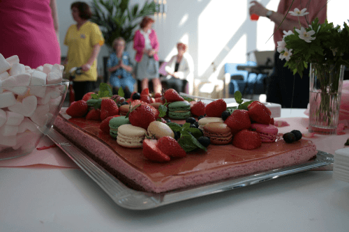 Tanssin pyörteiden jälkeen oli mukavaa istua alas ja nauttia Karpalon valmistamista juhlaherkuista. Tällä kertaa tarjolla oli kahvin ja teen kanssa suolaisia cakepopseja ja mansikkamoussekakkua. Virkistykseksi juhlaväelle maistui mansikkajuoma myös tanssin pyörteiden jälkeen.